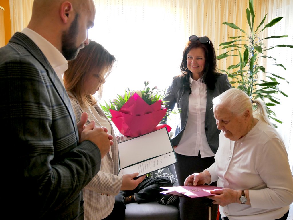 1 stycznia 2026 r. wyjątkowe, setne urodziny obchodziła mieszkanka Wyszkowa – Pani Helena Soliwoda. Z tej okazji Piotr Płochocki – Burmistrz Wyszkowa wraz z Dyrektor OPS Agnieszką Mróz odwiedzili Jubilatkę, by wręczyć jej kwiaty i złożyć najserdeczniejsze życzenia